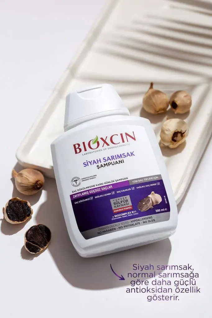 Bioxcin Siyah Sarımsak Özlü Şampuan, saç dökülmesine karşı güçlü bir koruma ve saç köklerini besleyici bir bakım sunar. Siyah sarımsak özütü, biotin ve keratin ile zenginleştirilen bu formül, saçı kökten uca güçlendirir, dökülmeyi azaltır ve daha hacimli bir görünüm kazandırır. Antioksidan ve antibakteriyel özellikleri ile saç derisini arındırır, kepek oluşumunu engeller ve sağlıklı büyümeyi destekler. SLS ve paraben içermeyen yapısıyla tüm saç tipleri için güvenlidir.