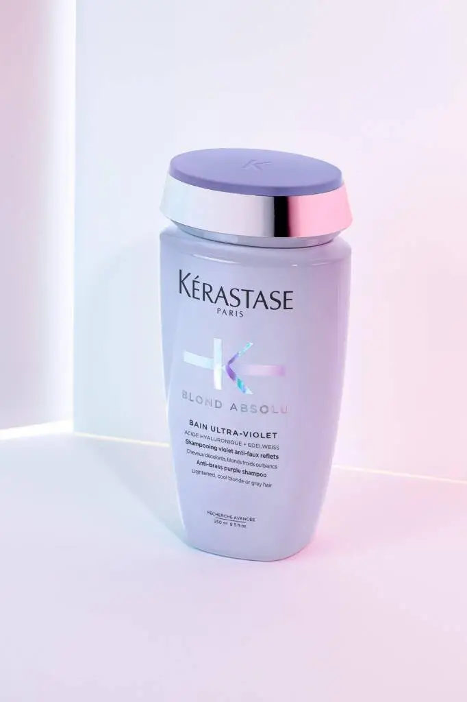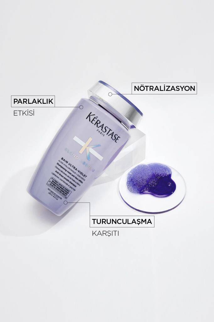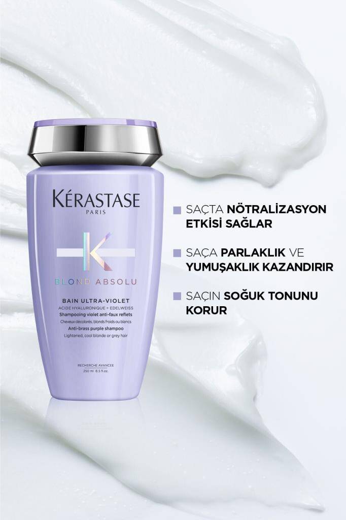 Kerastase Blond Absolu Bain Ultra-Violet, boyalı sarı, gri ve açık tonlu saçlar için özel olarak geliştirilmiş mor pigmentli bir şampuandır. Sarı ve istenmeyen tonları nötrleştirerek saça soğuk, parlak bir görünüm kazandırır. UV koruma özelliğiyle renk solmasını engeller, hyaluronik asit ve keratin içeren formülüyle saçı nemlendirir ve güçlendirir.