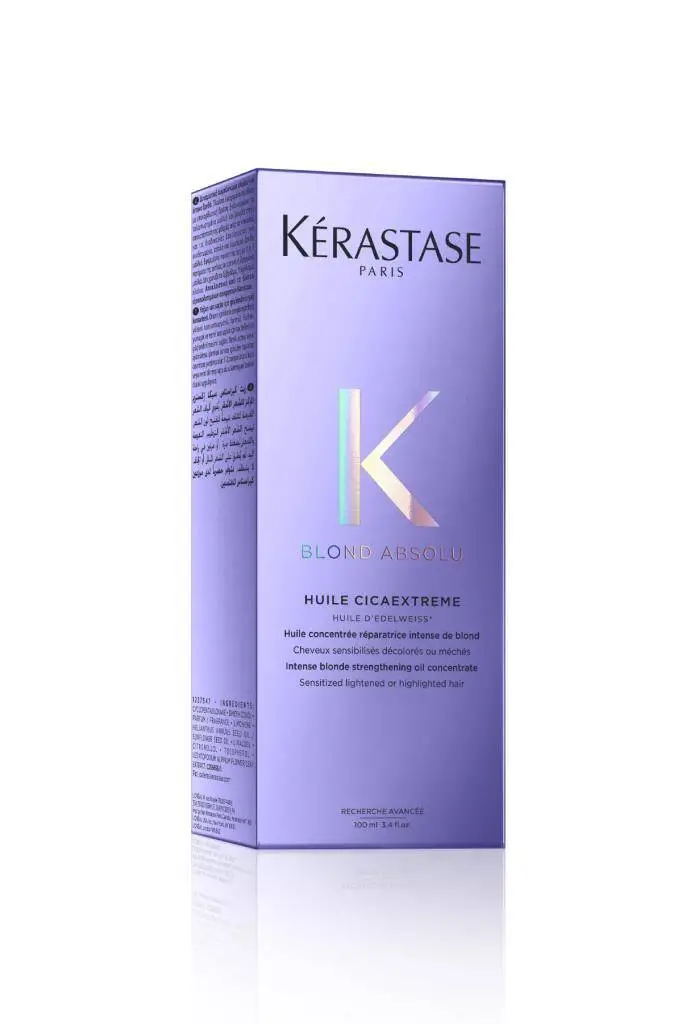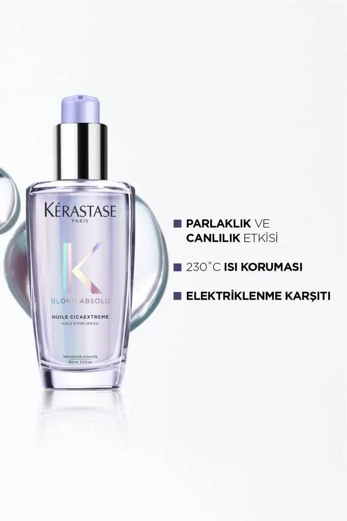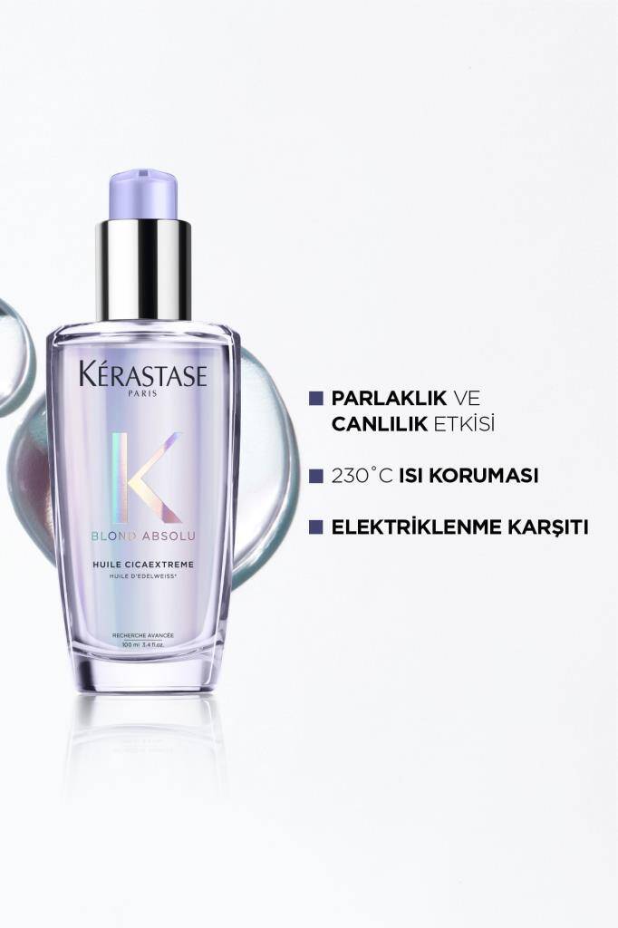 Kerastase Blond Absolu Huile Cicaextreme, boyalı, röfleli veya kimyasal işlem görmüş sarı saçlar için tasarlanmış yoğun parlaklık ve koruma sağlayan bir bakım yağıdır. Saçın yıpranmış yapısını onarır, UV ve ısı hasarına karşı kalkan oluşturur. İçeriğindeki ceramide, hyaluronik asit ve ışık yansıtıcı partiküller ile saça anında ışıltı kazandırırken, hafif formülüyle yapışkanlık hissi bırakmaz.