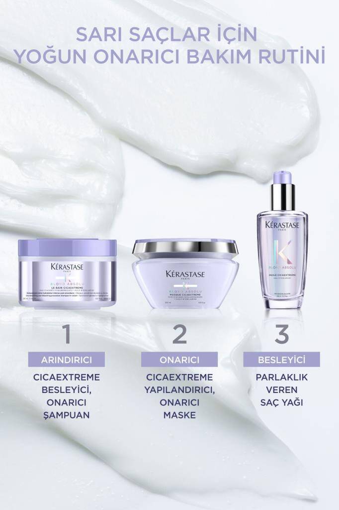 Kerastase Blond Absolu Masque Cicaextreme, boyalı, röfleli veya kimyasal işlem görmüş sarı saçlar için formüle edilmiş yoğun onarıcı ve koruyucu bir bakım maskesidir. Saçın yıpranmış yapısını derinlemesine güçlendirir, parlaklık kazandırır ve sarı tonların canlılığını uzun süre korur. İçeriğindeki ceramide, hyaluronik asit ve UV filtreleri ile hem nem dengesini sağlar hem de çevresel hasarlara karşı kalkan oluşturur.