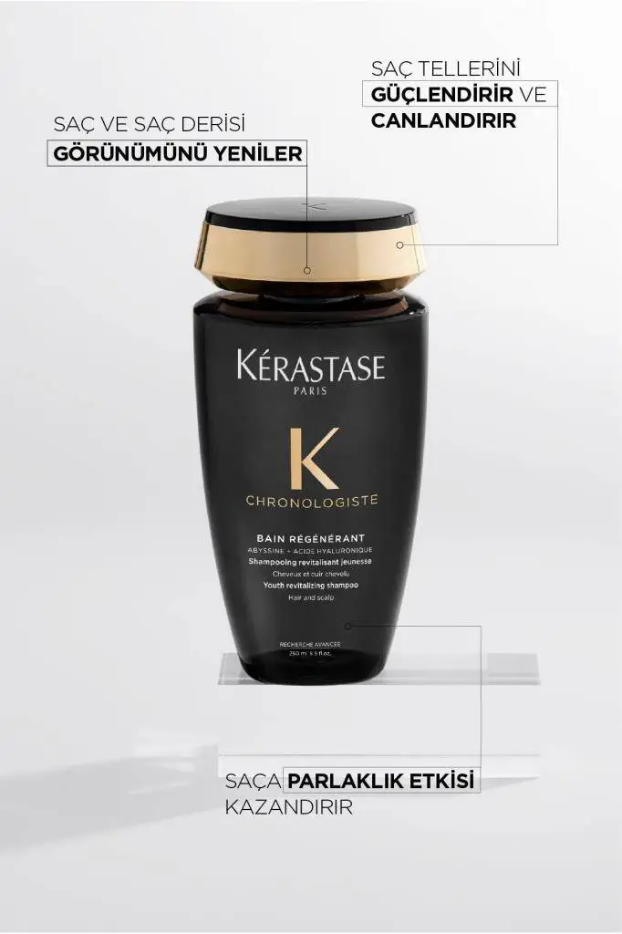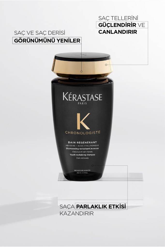 Kerastase Chronologiste Bain Regenerant, yıpranmış, yaşlanmış ve kimyasal hasarlı saçlar için geliştirilmiş lüks bir anti-aging şampuandır. Pro-Xylane™ ve Edelweiss Çiçeği Özütü ile saç köklerini güçlendirir, saç derisini yeniler ve saçın yoğunluğunu artırır. Hipoalerjenik, paraben ve silikon içermeyen formülü, saçı derinlemesine temizlerken nem dengesini korur.