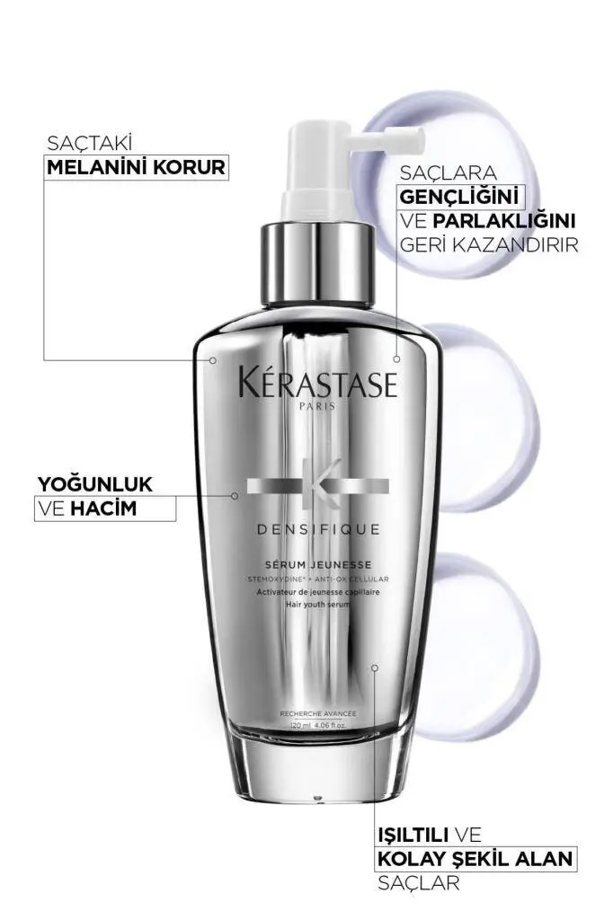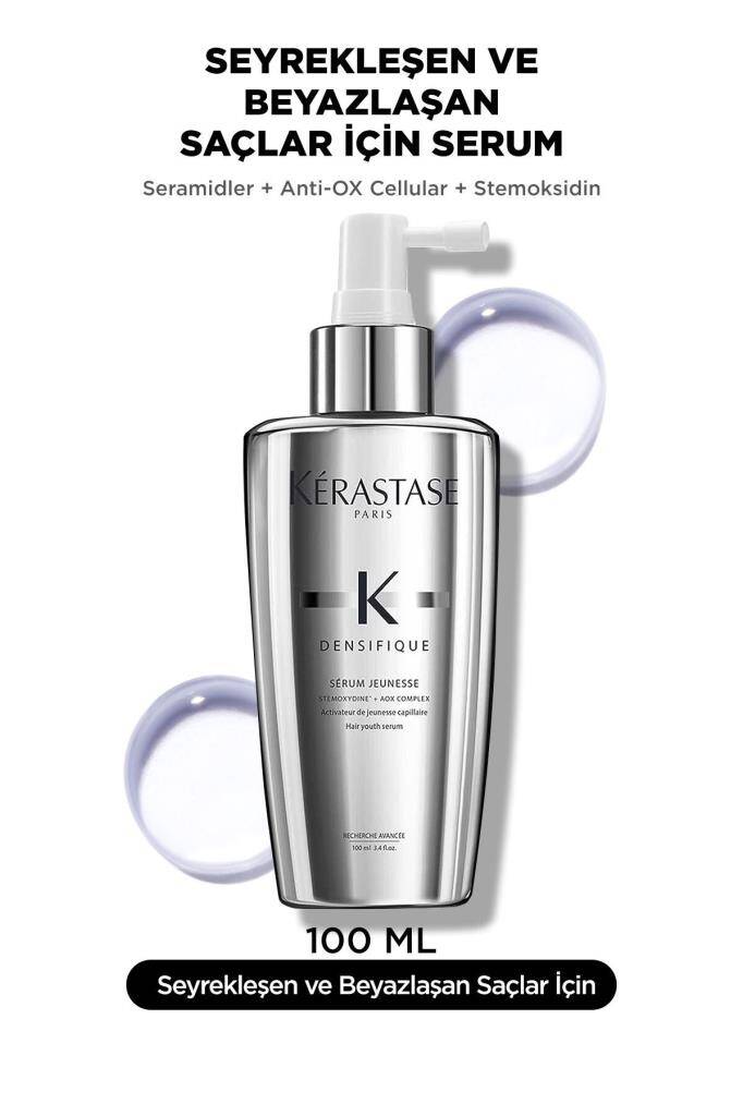 Kerastase Densifique Serum Jeunesse, ince, seyrek ve hacim kaybı yaşayan saçlar için klinik olarak geliştirilmiş, saç yoğunluğunu artıran ve saç köklerini güçlendiren anti-aging bir serumdur. Densifique Complex™ (patentli teknoloji) ile saçın kalınlığını %93 artırır, Hyaluronik Asit Türevi ile nem dengesini korur. Paraben, silikon ve alkol içermeyen, vegan dostu formülü ile dermatolog onaylıdır.