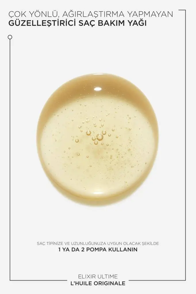 C: Saç yağları saçınızın daha güçlü, daha yumuşak ve daha parlak görünmesine yardımcı olabilir. Ayrıca saçları dış etkenlere karşı korur. Elixir Ultime, ısılı saç şekillendirme aletlerinin neden olduğu hasarlara karşı saçları koruma altına alır."