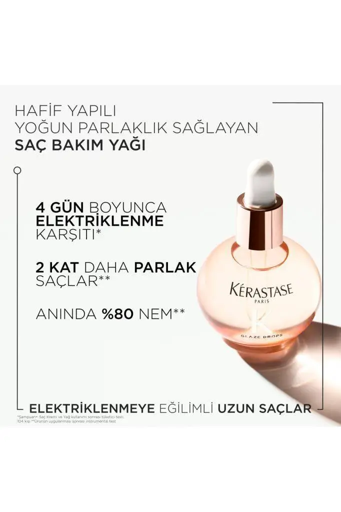Kerastase Gloss Absolu Glaze Drops, elektriklenmeye eğilimli saçlar için özel olarak formüle edilmiş, saça anında parlaklık ve yumuşaklık kazandıran bakım yağıdır. Saçları onarır, korur ve elektriklenmeyi önleyerek pürüzsüz bir görünüm sunar.