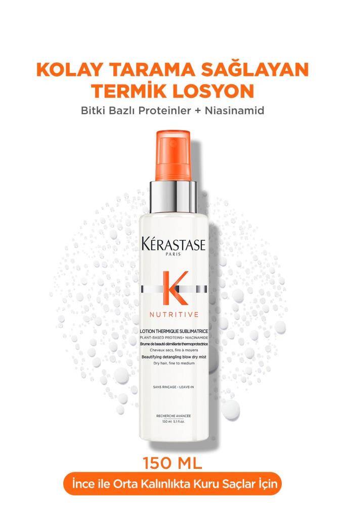 Kerastase Nutritive Lotion Thermique Sublimatrice Nemlendirici Isı Koruyucu Fön Spreyi, Kuru Saçlar İçin Termal Koruma ve Bakım, 150ml : Kerastase Nutritive Lotion Thermique Sublimatrice, kuru, hasarlı ve kabarık saçlar için özel olarak geliştirilmiş, 230°C'ye kadar ısı koruması sağlayan ve aynı zamanda derin nemlendirme sunan çok yönlü bir fön spreyidir. İçerdiği Lipidium Complex ve Ceramide teknolojisi ile saçı besler, kırıkları önler ve ipeksi bir parlaklık kazandırır.