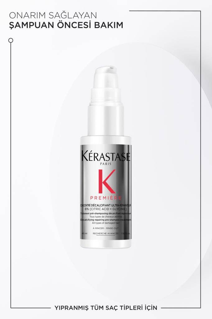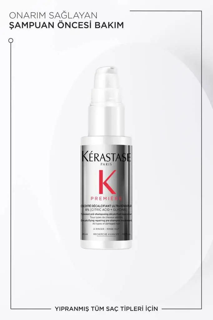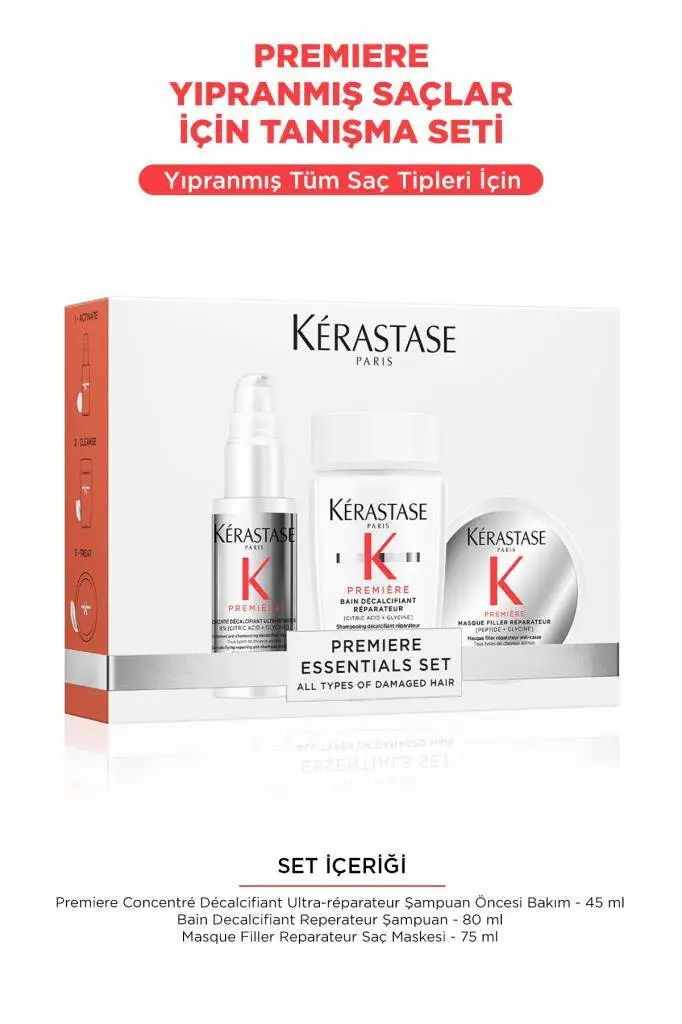 Kérastase Premiere Tanışma Seti, kimyasal işlem görmüş, kırılgan ve yıpranmış saçlar için özel olarak tasarlanmış bir onarım ve dekalsifikasyon setidir. Set içerisindeki Concentré Décalcifiant Ultra-Réparateur (dekalsifikasyon konsantresi), Bain Décalcifiant Réparateur (onarıcı şampuan) ve Masque Filler Réparateur (dolgulu onarım maskesi) ile saçı mineral birikiminden arındırır, kırılmaları önler ve yoğun nemlendirme sağlar.