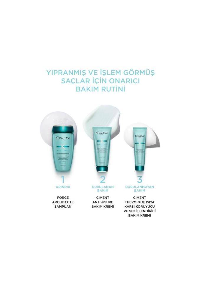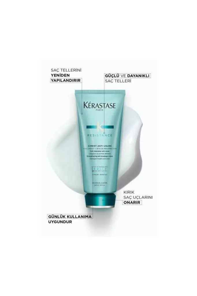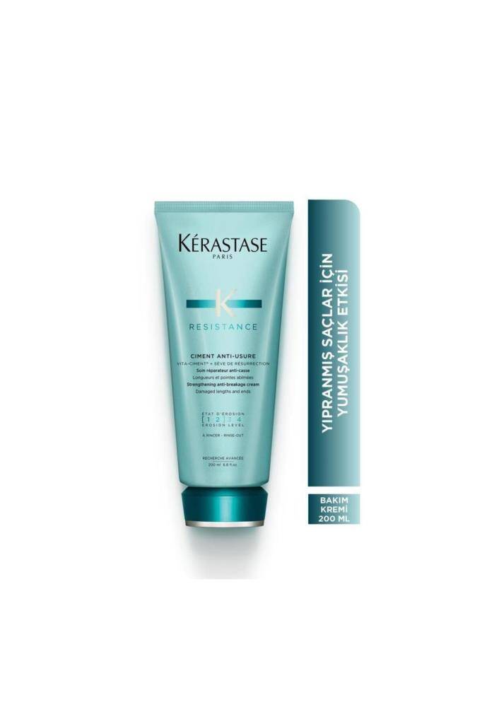 Kerastase Resistance Ciment Anti Usure, kırılgan, zayıf ve yıpranmış saçlar için klinik olarak geliştirilmiş, saçı içten dışa yeniden yapılandıran ve kırık oluşumunu %78’e kadar azaltan yoğun bir bakım kremidir. İçerdiği Intra-Cylane™ ve Ceramide R teknolojisi ile saçın yapısal bütünlüğünü korur, nem dengesini optimize eder ve saçı çevresel hasarlara karşı korur.