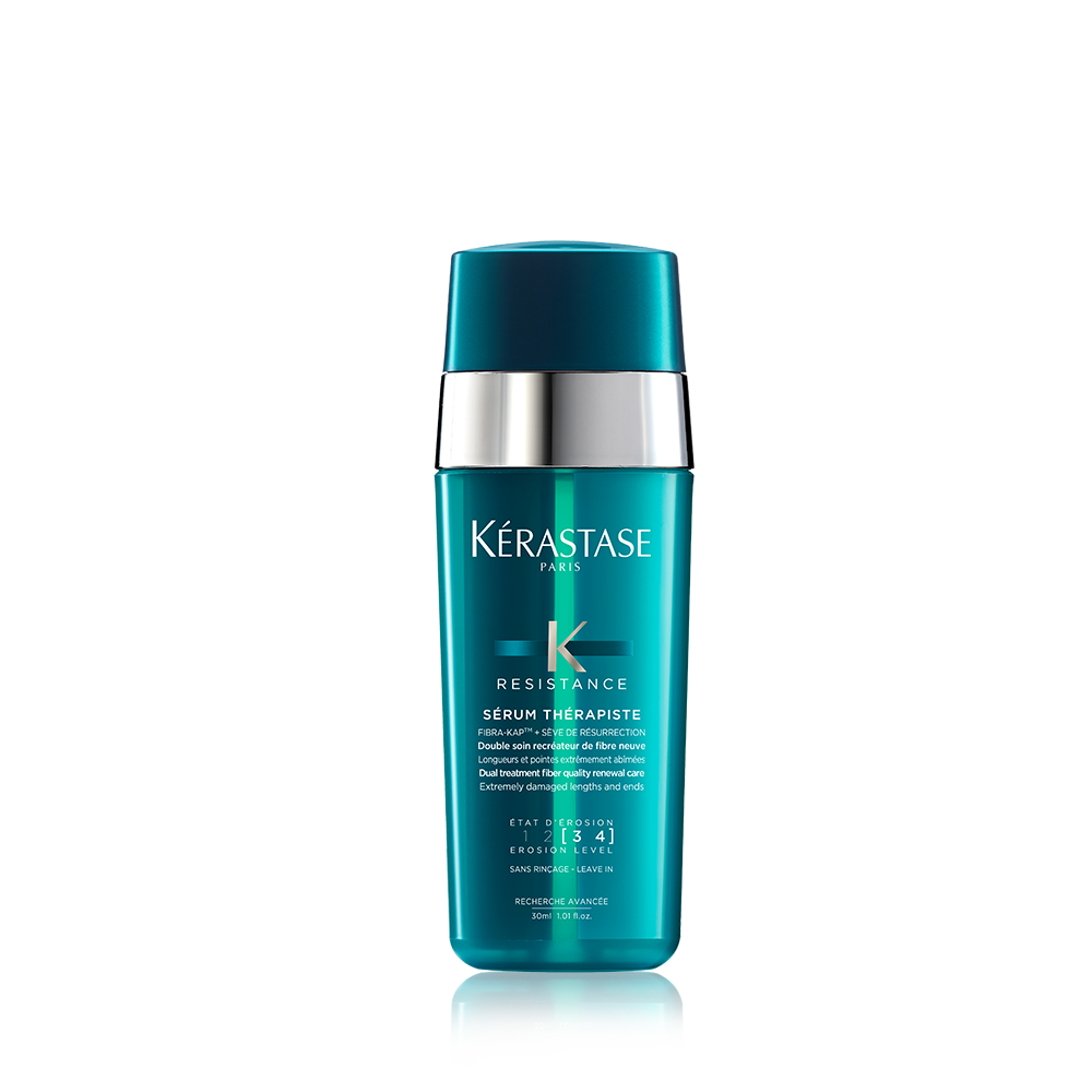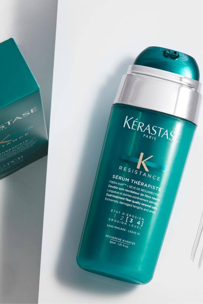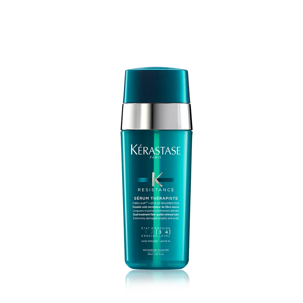 Kerastase Resistance Therapist Serum, kimyasal işlemler, sık boyama veya yüksek ısı nedeniyle aşırı yıpranmış saçlar için klinik olarak geliştirilmiş, saçı kökten uca yeniden yapılandıran ve kırık oluşumunu %88’e kadar azaltan yoğun bir bakım serumudur. İçerdiği Intra-Cylane™ ve Hyaluronik Asit teknolojisi ile saç derisini besler, saç liflerini güçlendirir ve elastikiyet kazandırır.