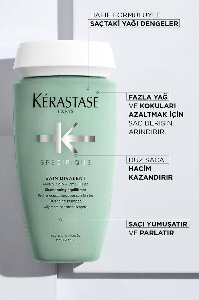 Kerastase Specifique Bain Divalent, yağlı saç derisi ve normalden yağlıya uzanan saç tipleri için özel olarak formüle edilmiş, sebum üretimini dengeleyen ve saçı kökten uca temizleyen bir şampuandır. İçerdiği Gluco Bileşeni ve Piroctone Olamine ile saç derisini arındırır, yağlanmayı geciktirir ve saçı hafifletici bir ferahlık sunar.