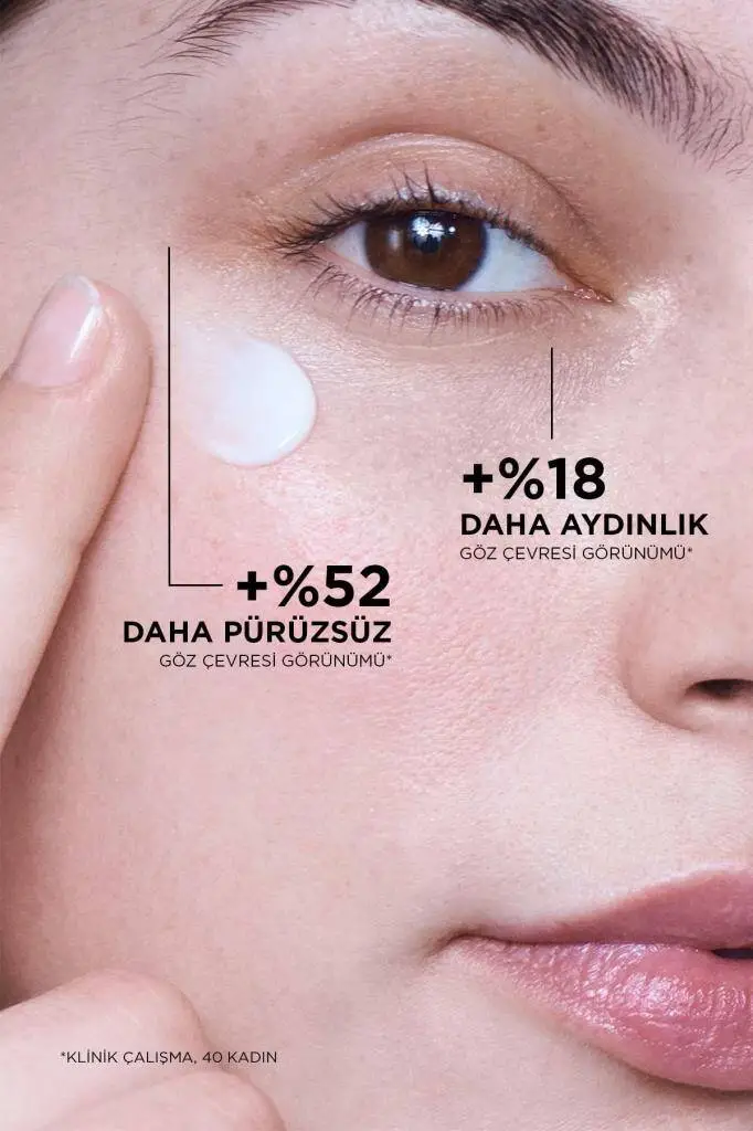 • Göz çevresini nemlendirir, pürüzsüzlük ve aydınlık görünüm sağlar, koyu halka ve göz altındaki ince çizgi görünümünü azaltır