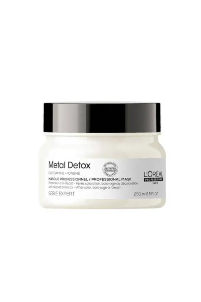 L'Oréal Professionnel Metal Detox Maske, boyalı, balyajlı veya açık tonlu saçlarda biriken bakır, demir ve diğer metalleri nötralize eden, renk tonlarının canlılığını koruyan ve saçı derinlemesine besleyen yoğun bir bakım ürünüdür. İçeriğindeki EDTA ve Citrate kompleksi ile metalleri temizler, hyaluronik asit ile nemlendirir ve saçı gelecek hasarlara karşı korur. 250ml boyutu ile hem ev hem de profesyonel kullanıma uygundur.