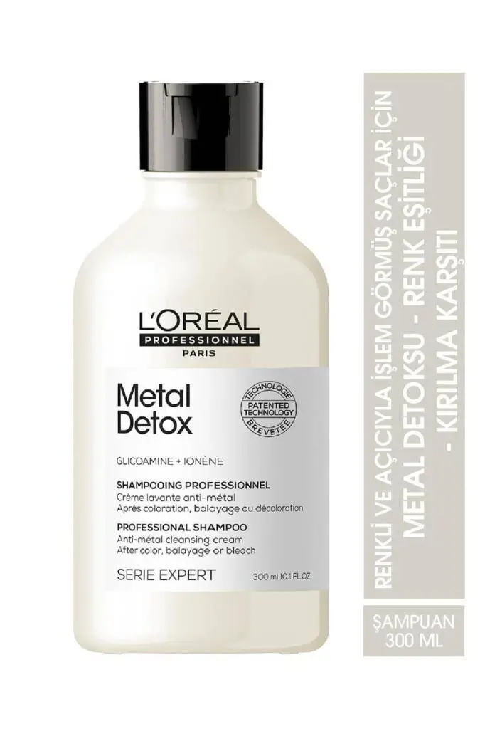 L'Oréal Professionnel Metal Detox Şampuan, renkli ve boyalı saçları sert su, klor ve çevresel metallerden arındırarak renk solmasını önleyen sülfatsız ve vegan bir bakım ürünüdür. İçeriğindeki EDTA ve Bakır Temizleyici Teknoloji ile saçta biriken metalleri nötralize eder, renk tonunu korur ve saçı yumuşak bir dokuda temizler. Paraben ve tuz içermeyen formülü, saç derisini tahriş etmez.