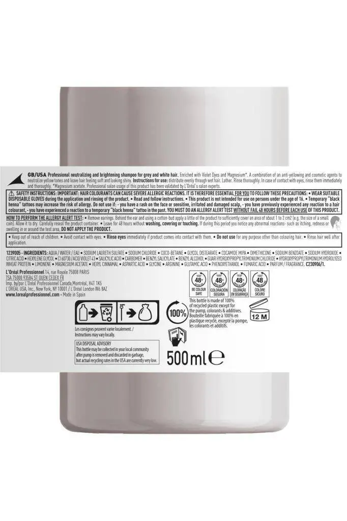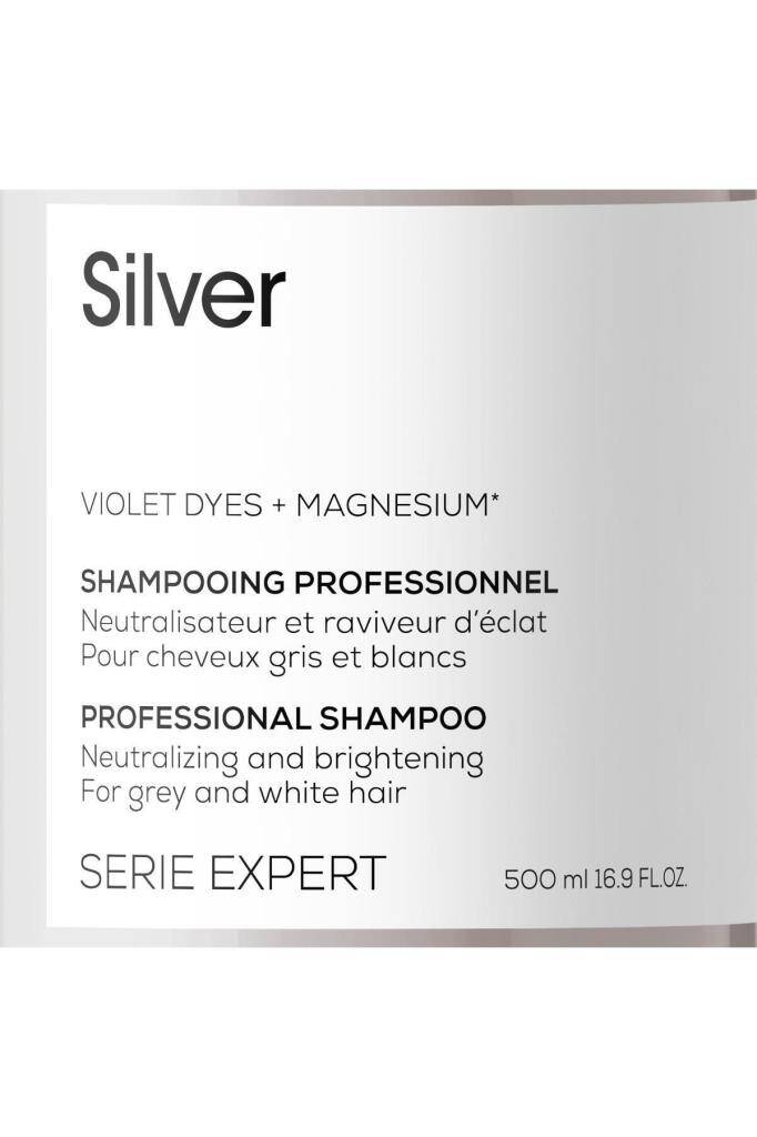 L'Oréal Professionnel Çok açık Sarı, Gri ve Beyaz Saçlar için Şampuan; diğer isimleriyle Silver ya da Mor şampuan gri, beyaz, platin sarı veya soğuk tonlardaki sarı saçlarda meydana gelebilecek renk solmalarını ve kızarmalarını önlemek amacıyla geliştirilmiştir. Boya sonrası saçlarda meydana gelen turuncu yansımaların oluşmasını engelleyerek saç renginizin korunmasını sağlar. Saçlarınızda canlı ve parlak bir görünüm yaratır.Çok açık sarı, gri ve beyaz saçlar için özel olarak geliştirilmiş formülüyle saçlardaki istenmeyen turuncu yansımaları içeriğindeki mor pigmentler ile nötralize eder.