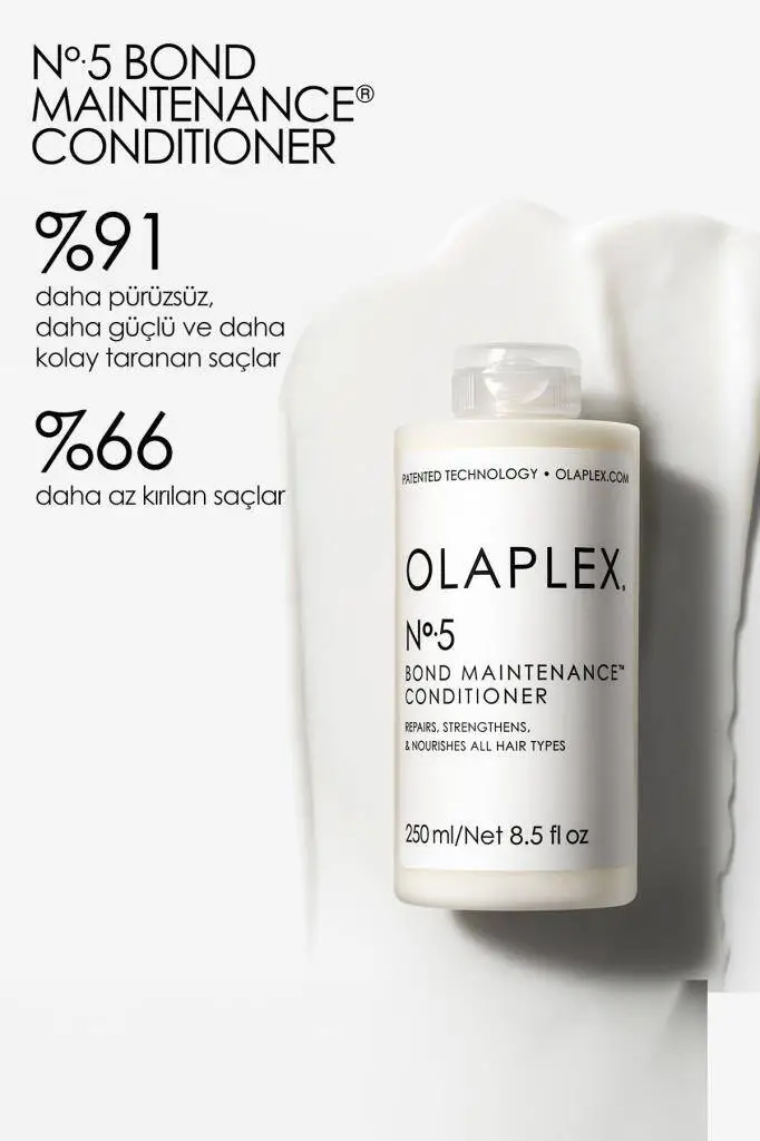 Olaplex Nº.5 Bond Maintenance Conditioner, kimyasal işlemler, ısı hasarı veya çevresel faktörlerle zayıflamış saçlar için tasarlanmış günlük onarım ve nemlendirme odaklı bir bakım kremidir. Bis-Aminopropyl Diglycol Dimaleate teknolojisi ile saçın iç bağlarını güçlendirir, nem dengesini korur ve saça pürüzsüz bir dokunuş kazandırır. Tüm saç tipleri, özellikle kuru, boyalı veya kıvırcık saçlar için idealdir.
