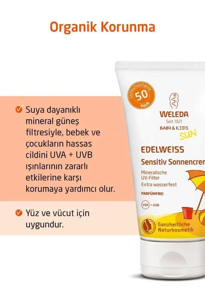 Weleda Baby and Kids Edelweiss Organik Güneş Koruyucu Krem SPF50, bebeklerin ve çocukların hassas ciltlerini güneşin zararlı UV ışınlarına karşı korumak için özel olarak formüle edilmiş organik bir güneş koruyucudur. Yüksek koruma faktörü ve doğal içerikleriyle cildi UVA ve UVB ışınlarına karşı korurken, aynı zamanda cildi nemlendirir ve besler. Tüm cilt tipleri için uygun olan bu krem, özellikle bebeklerin ve çocukların hassas ciltleri için idealdir.